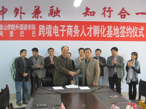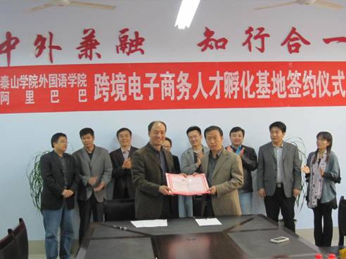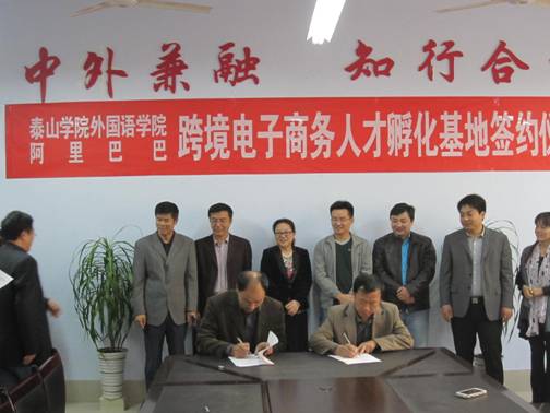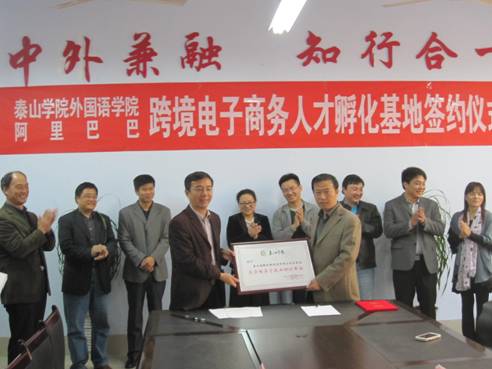 2014年10月22日,泰山學(xué)院外國語學(xué)院阿里巴巴跨境電子商務(wù)人才孵化基地簽約儀式,在泰山學(xué)院外國語學(xué)院舉行。泰山學(xué)院外國語學(xué)院的書記、院長和阿里學(xué)院的院長及泰安網(wǎng)商會理事單位的主要領(lǐng)導(dǎo)參加了簽約儀式。泰安海數(shù)公司作為泰安網(wǎng)商會的理事單位參加了簽約儀式,蘇總參加了簽約,并接受了大學(xué)生就業(yè)創(chuàng)業(yè)孵化基地導(dǎo)師聘書和大學(xué)生實(shí)習(xí)就業(yè)協(xié)議單位授牌。