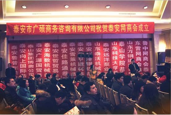 2015年1月26日,泰安市網商協(xié)會成立大會在泰安寶龍福朋酒店隆重舉行。參會的有泰安市政府領導、泰山區(qū)區(qū)委書記和阿里巴巴北方區(qū)域、泰安市商務局、泰山區(qū)商務局、市建行、泰山學院、山東科技大學、市外網商會等多家單位的主要領導以及泰安網商會全體會員。